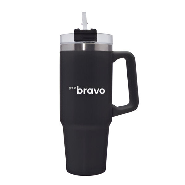 Termo con doble pared de acero inoxidable, insulado al vacío, acabado rugoso, con asa lateral y tapa enroscable con popote. 1200 ml